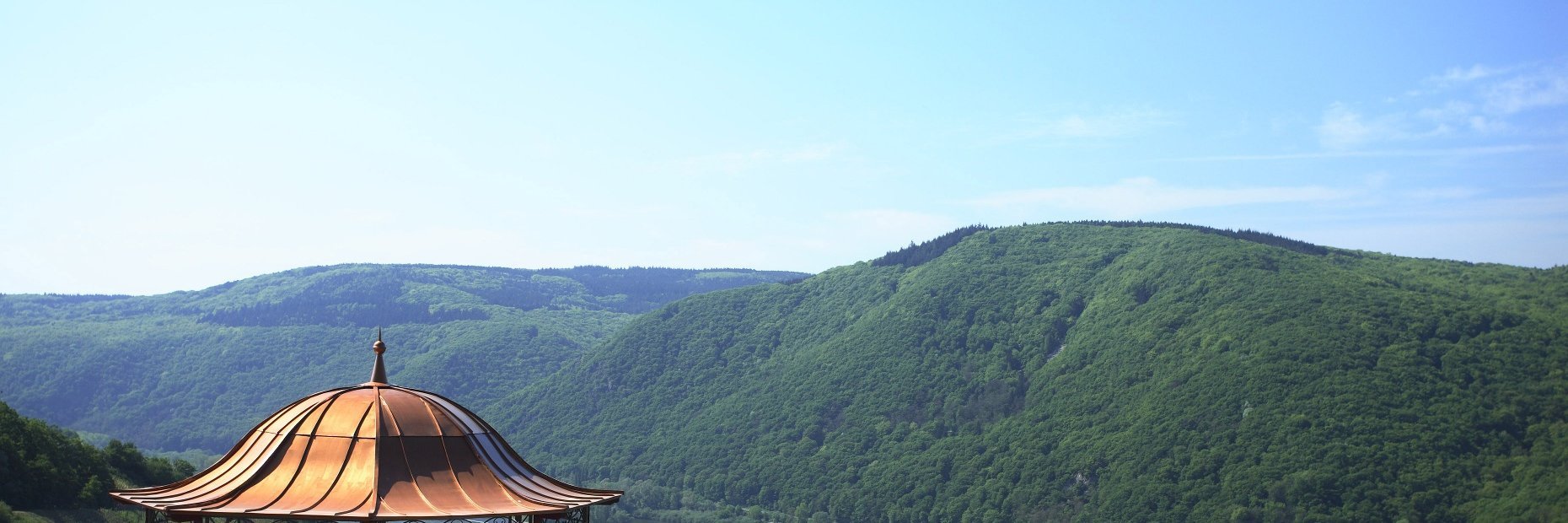Die Route biegt nach rechts in die Straße „Am alten Rathaus“ ein, unterquert die Eisenbahnstrecke und biegt direkt dahinter nach links in die „Lorcher Straße“ ein. Von deren Ende  führt der Weg in fünf Kurven im Höllenberg stetig bergauf. Weiter oben gibt es die Möglichkeit, kurz zur Rotweinlaube abzuzweigen. Der Exkurs (knapp 100 Meer) belohnt mit einem der prächtigsten Panoramablicke im gesamten Mittelrheintal – und einem Depot, in dem gekühlter Wein auf Wanderer wartet. Der gemütliche Pavillon mit dem markanten Kupferdach ist ein Relikt aus Margarethe von Trottas Film „Ich bin die Andere“ mit Katja Riemann und Armin Mueller-Stahl aus dem Jahr 2006. Er sollte nach den Dreharbeiten eingemottet werden, doch rührige Einheimische setzten sich dafür ein, dass er wenige Meter oberhalb seines Filmstandortes einen neuen dauerhaften Platz bekam.