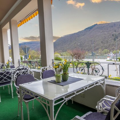 Regardless of which of the two terraces you choose, the Rhine is always in your field of vision. The Rhine terrace offers a perfect spot on the sunny side of the hotel for delightful breaks with coffee and homemade cake. The Assmannshausen red wine cake is one of the special house specialties, but attractive ice cream sundaes, snacks, and cool refreshments also accompany the direct view of the Rhine and its ships.