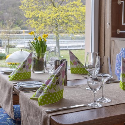 The garden terrace, on the other hand, exudes a touch of the South. Terracotta pots filled with lush herbs and Mediterranean-looking plants create a sunny atmosphere even on cloudy summer days. Here too, one can relax pleasantly – leisurely enjoying an open-air breakfast, light lunchtime dishes, sweet afternoon temptations, and fine regional menus in the balmy evening air.