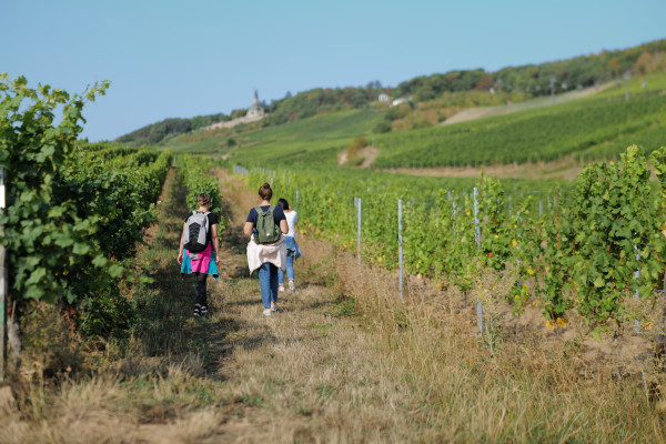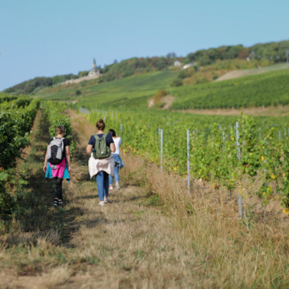 Wandern Sie alleine durch die Rüdesheimer Weinberge auf einem empfohlenen Rundweg, genießen Sie dabei die herrliche Landschaft und vier unserer Weine.