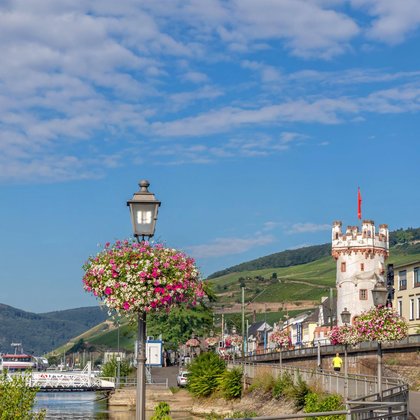 From Rüdesheim, you start along the Rhine always keeping an eye on the ship traffic until you reach the wine, sparkling wine, and rose town of Eltville am Rhein. The return route leads via the R3a with gentle climbs through the vineyards. Worthwhile stops are the former Cistercian Abbey Eberbach and Schloss Vollrads near Winkel.