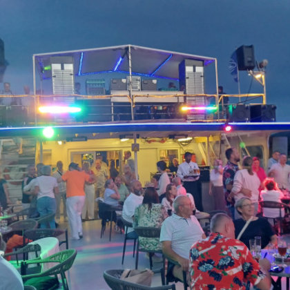 Food & Music: Begin your evening with a sparkling wine reception on board. During the cruise, enjoy a varied summer buffet including starters, main courses, and desserts. A selection of drinks (beer, wine, soft drinks, Ramazotti) is included in the price. A DJ will provide music and party vibes – open air on the sun deck, weather permitting.