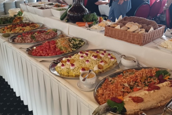 Starters: Coburg ham with melon, pasta salad, fresh leafy salads with assorted dressings, chicken fillet with exotic fruits, assorted breads, butter, and herb butter