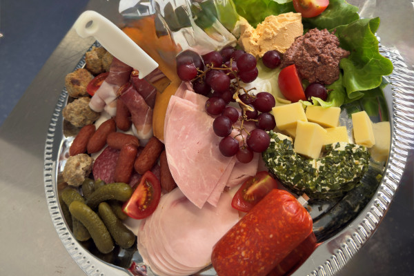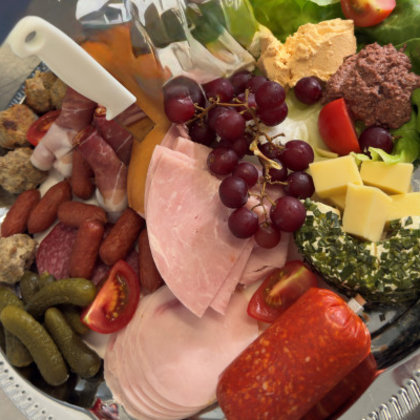 Hearty winegrower's snack with sausage, ham, various cheeses, etc., accompanied by bread, butter, and potato salad, Rheingau wines, beer (Pilsner + wheat beer), and non-alcoholic beverages.