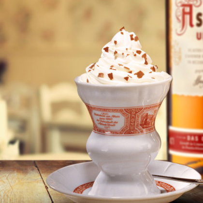Our Rüdesheim coffee is flambéed at the table in the traditional way: Fine Asbach Uralt is flambéed before freshly brewed coffee is added. The whole thing is topped off with an airy topping of cream sprinkled with delicate chocolate - a unique moment of pleasure that tantalises the senses.