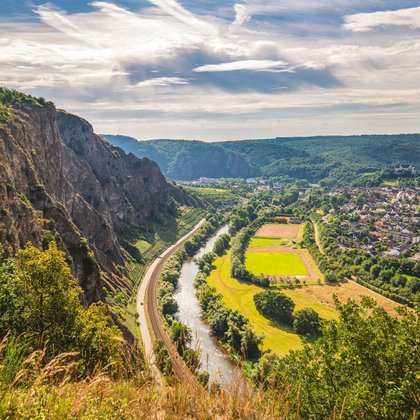 The route starts with a true holiday feeling: With the Bingen-Rüdesheim Rhine ferry, you cross the river at the gateway to the Upper Middle Rhine Valley World Heritage Site. The Nahe cycle path runs along the idyllic river to the spa town of Bad Kreuznach, famous for the Salinenthal with the graduation towers, which are considered the largest open-air inhalatorium in Europe. Another highlight awaits you shortly after Bad Münster am Stein-Ebernburg: the highest steep cliff in Germany north of the Alps, the Rotenfels massif. The return journey is along the same route or comfortably by train to Bingen.