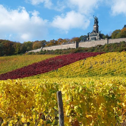 Through the varied Höllental, the route leaves the Rhine Valley towards Aulhausen, a small, tranquil village. From Aulhausen, it goes up into the Niederwald. Here, the character of the tour changes - from the open vineyard landscape the paths now lead into the forest. You cross the idyllic little avenue to the hunting lodge, which belongs to the Ostein Park, and shortly after reach the Niederwald Monument with the impressive view into the Rhine Valley. In the final section, it steadily goes downhill through the vineyards towards Rüdesheim back to the starting point.