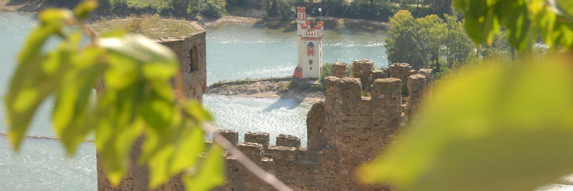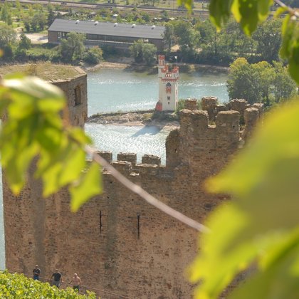 If you start the route in Rüdesheim, it leads past Brömser Castle directly up into the vineyards and then through the vineyards (mostly Riesling) towards Assmannshausen. The route runs above the Ehrenfels castle ruins. In this section, you can enjoy a special view both into the broad Upper Rhine Valley and the deeply cut Middle Rhine Valley as well as the Mäuseturm directly opposite. A small loop leads directly to the castle ruins and returns with a steep staircase back to the main route, accompanied here by diverse bushes. The paths then twist down to Assmannshausen and go steeply up the vineyards (mostly red wine) directly opposite again. But before that, you should not miss a short detour into the village with its numerous dining options.