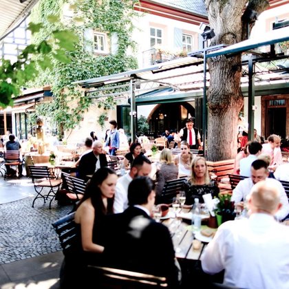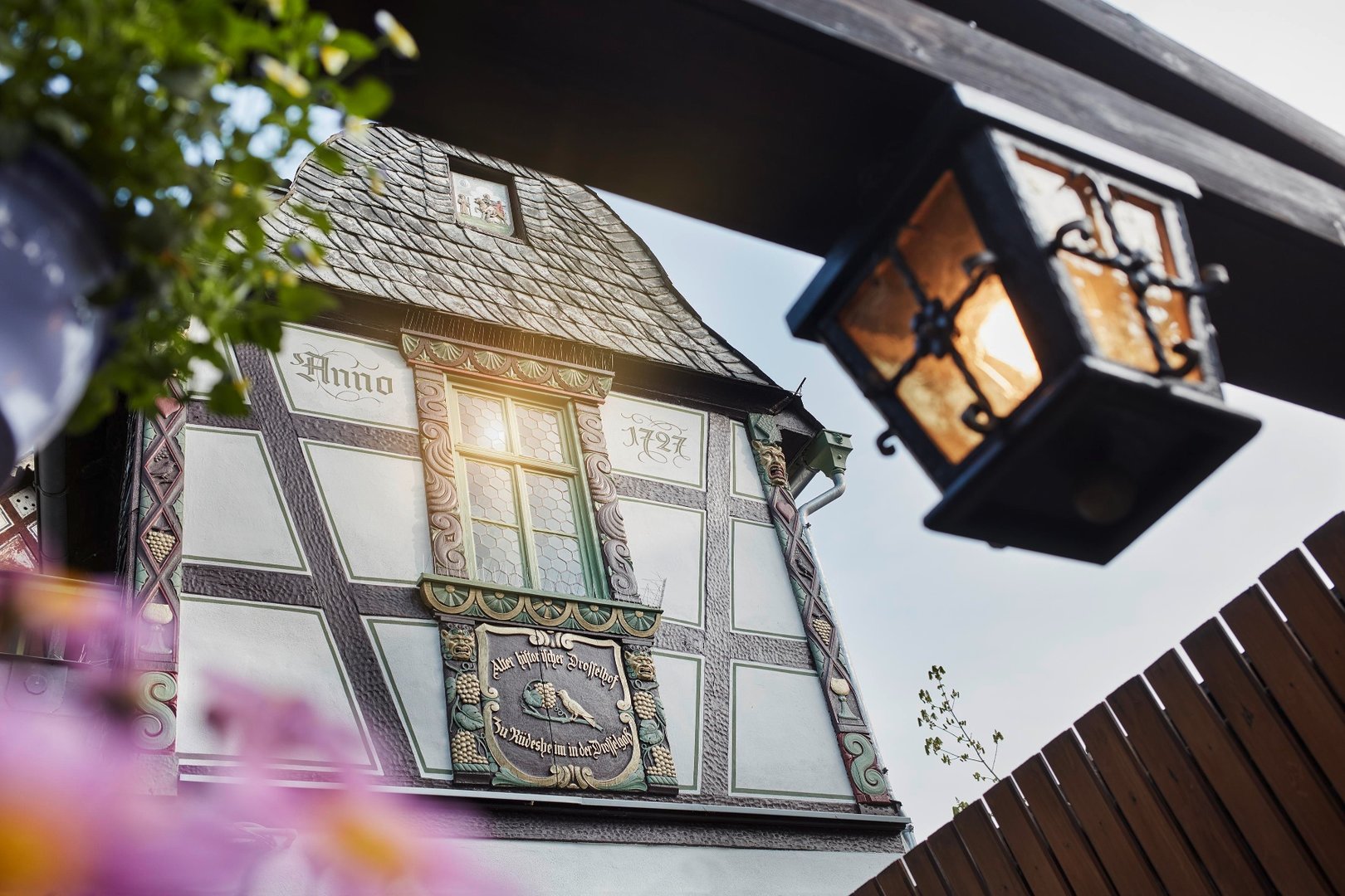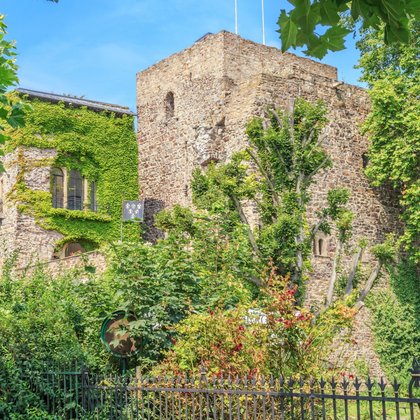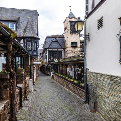 It starts with Mr. "Asbach and the Spirit of Wine". Clearly: Nothing was too difficult for this distiller: Why else should the young Hugo Asbach return from his training in France to found his start-up here? This was the start of a real global success! Just scan, this story is truly spirited. Walk from here to the Brömser Castle. It has already survived over a millennium and is one of the oldest castles on the Rhine! The scan leads to a trip into the castle history of Rüdesheim. Walk a bit further along Rheinstraße and you will reach the Drosselgasse. Now listen to the very different stories of our alleys. Why does no one know Schützengasse, but everyone knows Drosselgasse?