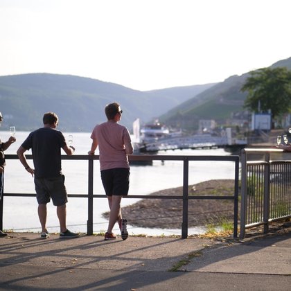 From here, the path leads through the vineyards always keeping the Rhine and the vines in sight down to the outskirts of Rüdesheim. Behind the cemetery, you go under the railway underpass. Once you have crossed the street (B42), a quiet path leads to the ruin of the Hindenburg Bridge. Over 1100 meters that have disappeared: The Hindenburg Bridge was once the second largest Rhine bridge. Today, not much remains of it. Why, you will learn from the scan about the "Bridge of Remembrance".