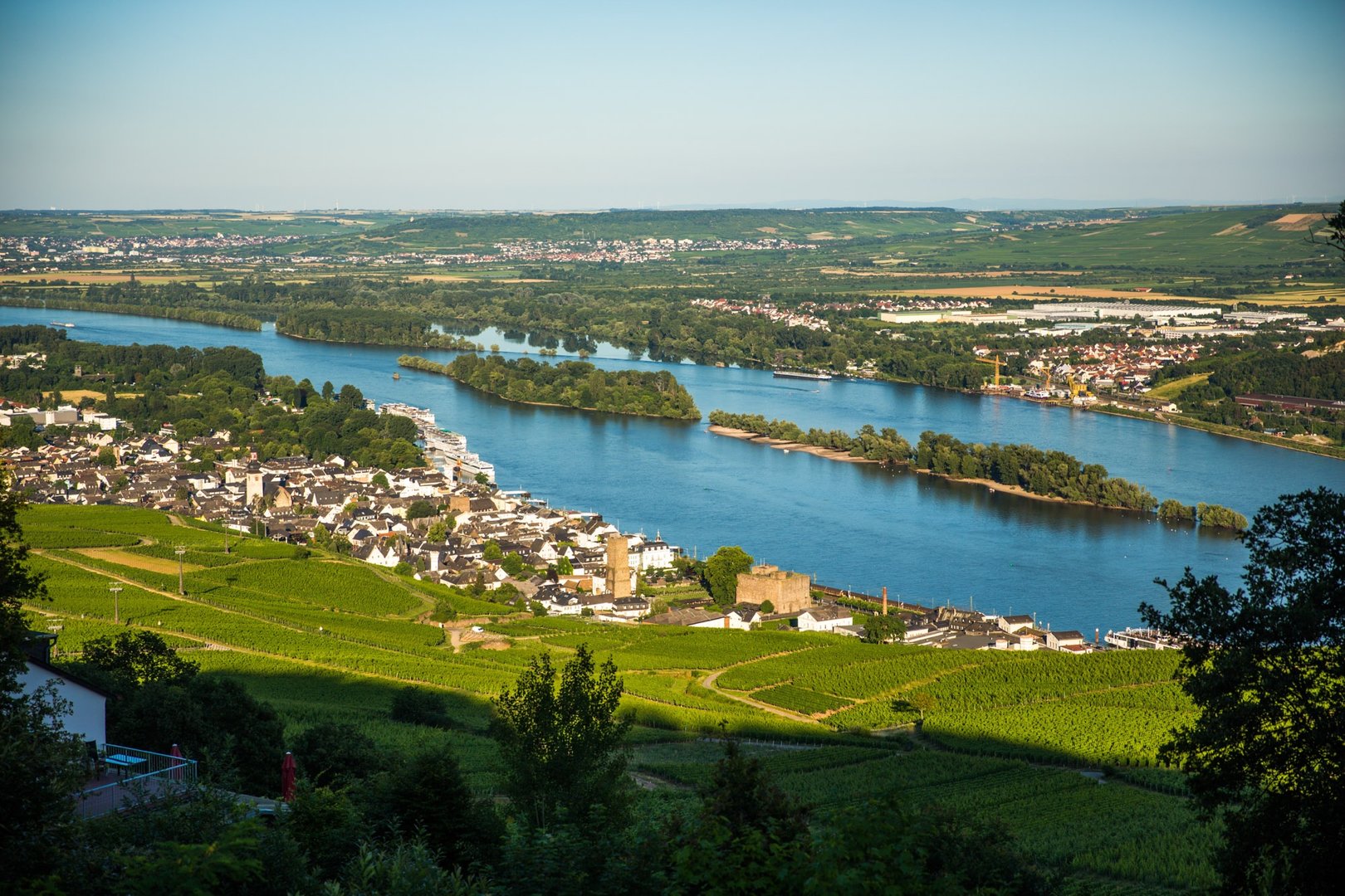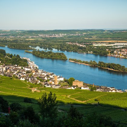 High above Rüdesheim, at the Niederwald Monument, you first see the World Heritage Upper Middle Rhine Valley! But first, the Rheinsteig leads through vineyards and forest to the magic cave. Then follows the descent into the red wine mecca Assmannshausen.