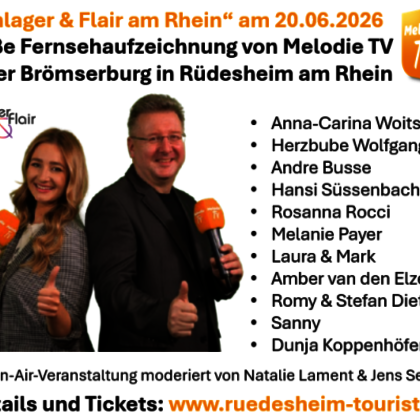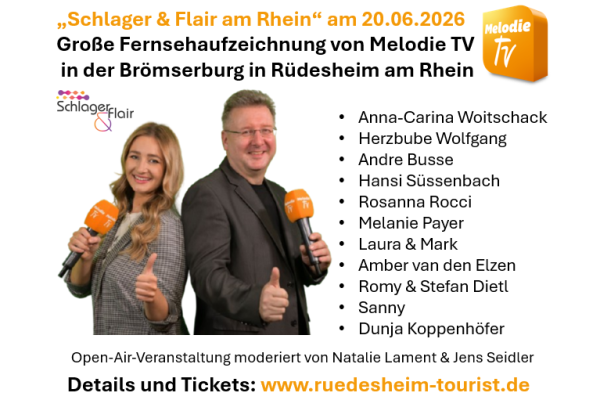 Erleben Sie ein unvergessliches Wochenende in der romantischen Altstadt von Rüdesheim und seien Sie live dabei, wenn Melodie TV zur großen Open-Air-Aufzeichnung von„Schlager & Flair am Rhein“ in die historische Brömserburg einlädt!