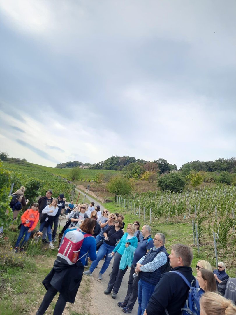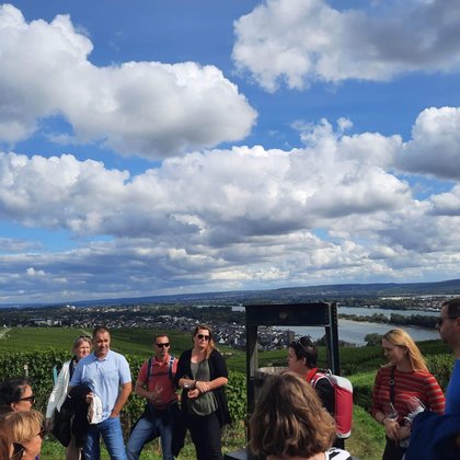 Begleitet wird die Weinwanderung von Jeannine Oehlke, der Frau des Winzers, sowie der Kultur- und Weinbotschafterin Jacqueline Palzer. Mit viel Freude und Leidenschaft begleitet Jeannine die Tour und sorgt gemeinsam mit Jacqueline für eine entspannte, angenehme Atmosphäre. Dabei erhalten Sie interessante Einblicke rund um Wein, Weinanbau, Rüdesheim und die Region Rheingau. Ein kleiner Snack rundet das Genusserlebnis ab.