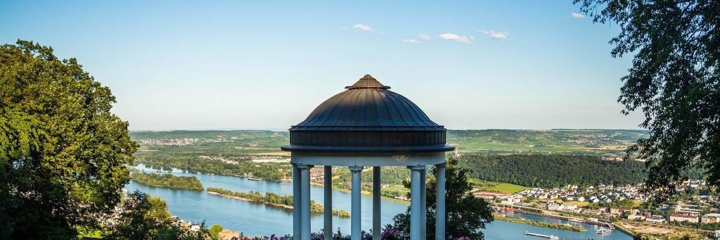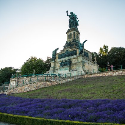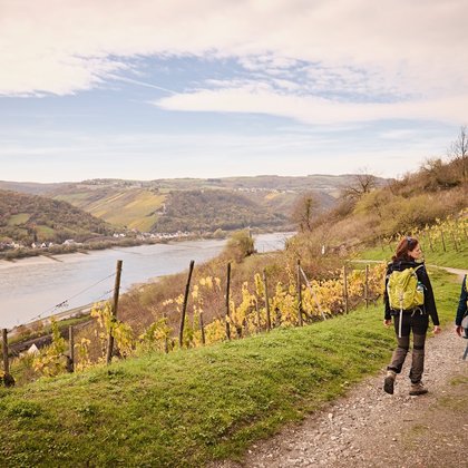 Hoch über Rüdesheim, am Niederwalddenkmal hat man es erstmals im Blick: das Welterbe Mittelrheintal! Doch zunächst führt der Rheinsteig durch Weinberge und Wald zur Zauberhöhle. Dann folgt der Abstieg ins Rotweinmekka Assmannshausen.