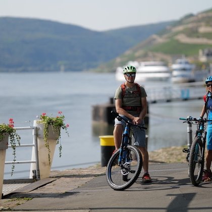 Die Tour startet mit echten Urlaubsfeeling: Mit der Rheinfähre der Bingen-Rüdesheimer überquert Ihr am Tor zum Welterbe Oberes Mittelrheintal den Fluss. Der Naheradweg führt entlang des idyllischen Flüsschens bis zur Kurstadt Bad Kreuznach, berühmt für das Salinenthal mit den Gradierwerken, die als größtes Freiluftinhalatorium Europas gelten. Ein weiterer Superlativ erwartet Euch kurz hinter Bad Münster am Stein-Ebernburg: die höchste Steilwand Deutschlands nördlich der Alpen, das Rotenfelsmassiv. Zurück geht es auf gleichem Weg oder ganz bequem per Bahn bis Bingen.