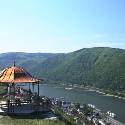 Die Route biegt nach rechts in die Straße „Am alten Rathaus“ ein, unterquert die Eisenbahnstrecke und biegt direkt dahinter nach links in die „Lorcher Straße“ ein. Von deren Ende führt der Weg in fünf Kurven im Höllenberg stetig bergauf. Weiter oben gibt es die Möglichkeit, kurz zur Rotweinlaube abzuzweigen. Der Exkurs (knapp 100 Meer) belohnt mit einem der prächtigsten Panoramablicke im gesamten Mittelrheintal – und einem Depot, in dem gekühlter Wein auf Wanderer wartet. Der gemütliche Pavillon mit dem markanten Kupferdach ist ein Relikt aus Margarethe von Trottas Film „Ich bin die Andere“ mit Katja Riemann und Armin Mueller-Stahl aus dem Jahr 2006. Er sollte nach den Dreharbeiten eingemottet werden, doch rührige Einheimische setzten sich dafür ein, dass er wenige Meter oberhalb seines Filmstandortes einen neuen dauerhaften Platz bekam.