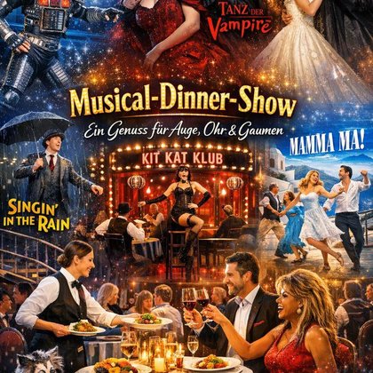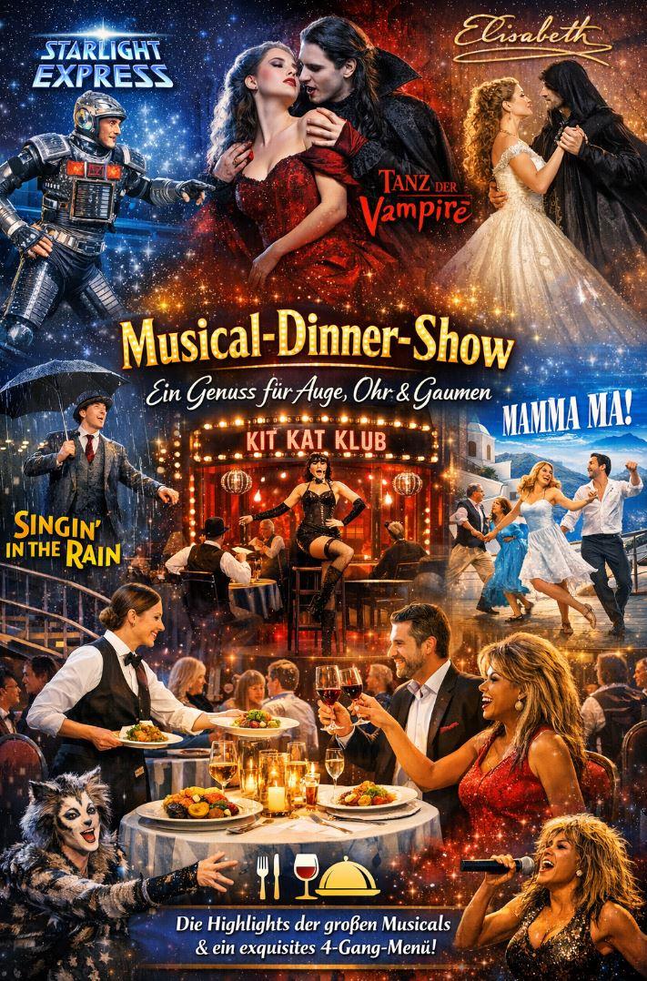 Die Gäste unserer Musical-Dinner-Show erwartet ein bunter 4 1/2-stündiger Abend mit den Highlights aus den ganz großen Musicalerfolgen, charmant moderiert mit dem ein oder anderen Blick hinter die Kulissen und kombiniert mit einem exquisiten 4-Gang-Menü.
