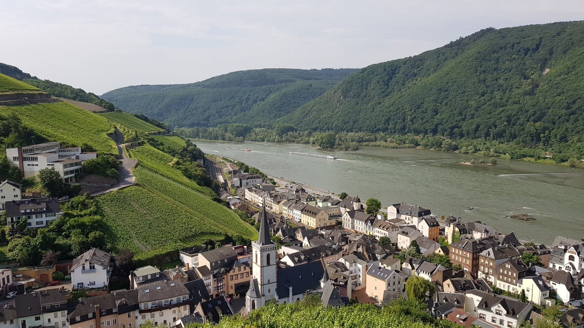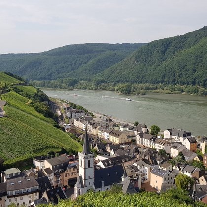 Die Route biegt nach rechts in die Straße „Am alten Rathaus“ ein, unterquert die Eisenbahnstrecke und biegt direkt dahinter nach links in die „Lorcher Straße“ ein. Von deren Ende führt der Weg in fünf Kurven im Höllenberg stetig bergauf. Weiter oben gibt es die Möglichkeit, kurz zur Rotweinlaube abzuzweigen. Der Exkurs (knapp 100 Meer) belohnt mit einem der prächtigsten Panoramablicke im gesamten Mittelrheintal – und einem Depot, in dem gekühlter Wein auf Wanderer wartet. Der gemütliche Pavillon mit dem markanten Kupferdach ist ein Relikt aus Margarethe von Trottas Film „Ich bin die Andere“ mit Katja Riemann und Armin Mueller-Stahl aus dem Jahr 2006. Er sollte nach den Dreharbeiten eingemottet werden, doch rührige Einheimische setzten sich dafür ein, dass er wenige Meter oberhalb seines Filmstandortes einen neuen dauerhaften Platz bekam.