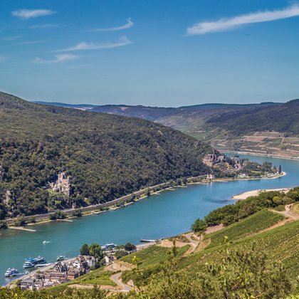 In der untersten Rechtskurve öffnet sich plötzlich ein prächtiges Panorama. Der Rhein gurgelt durch die Gefällstrecke des Binger Lochs, hier hat er mit 14 Kilometern pro Stunde die höchste Strömungsgeschwindigkeit auf seinem Weg von der Quelle im schweizerischen Graubünden bis zur Mündung ins Meer. In der Kurve lohnt es, sich umzudrehen und den Blick direkt auf den Felssporn zu richten: Die vor Jahrmillionen einst waagrecht aufeinandergeschichteten Platten wurden durch gewaltige tektonische Verschiebungen senkrecht aufgestellt. Das Phänomen, das im Oberen Mittelrheintal an vielen Stellen (z.B. der Loreley) offen zutage tritt, weist darauf hin, dass das Rheinische Schiefergebirge (wie der Himalaya und die Alpen) ein erdgeschichtlich junges Faltengebirge ist.